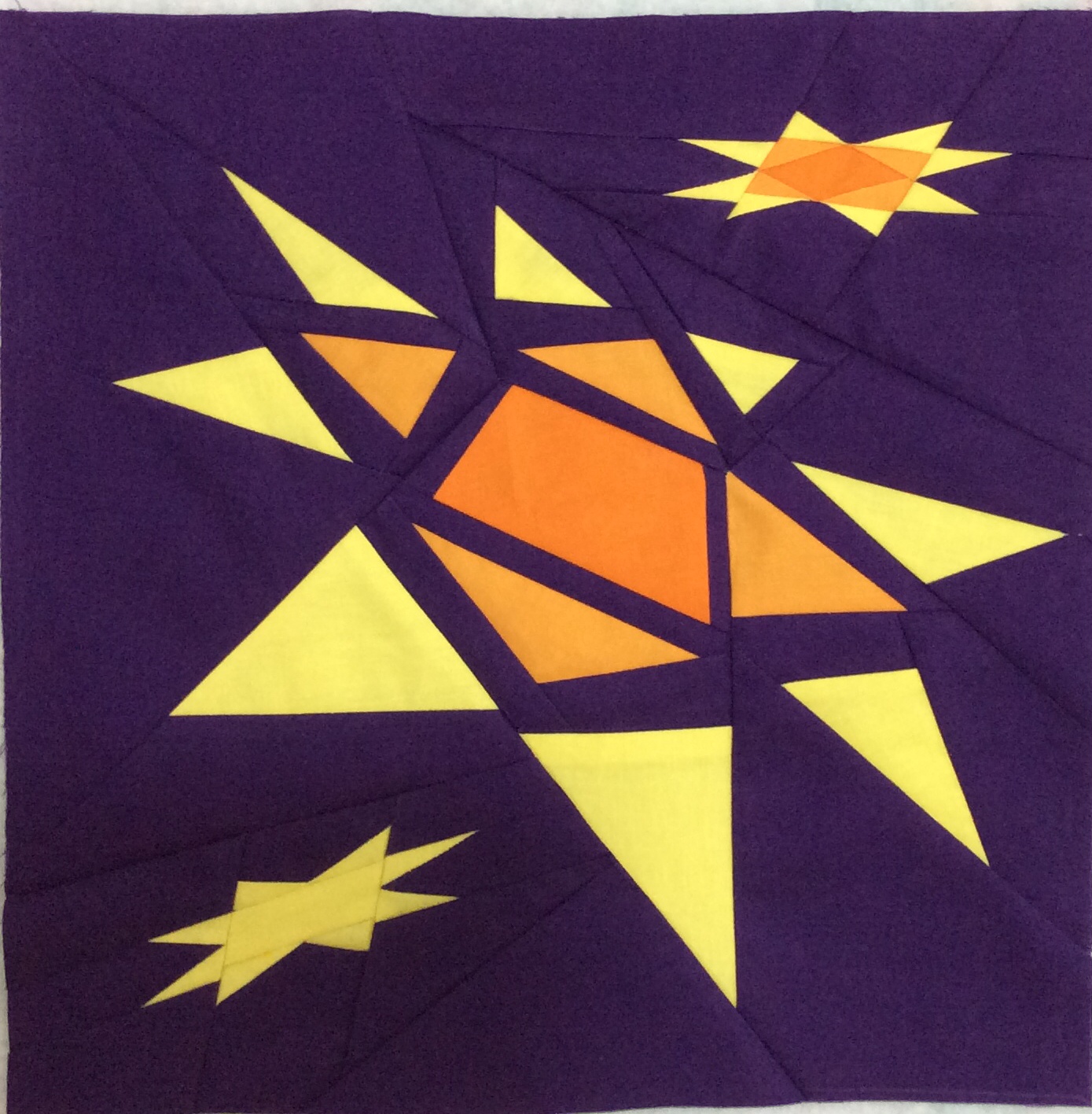Supernova Ohio Star is my rendition of the traditional  Ohio Star block.  The block was designed in idraw and paper pieced using Michael Miller cotton couture fabrics:  amethyst, orange, apricot, lemon.  VOTE for my block by going to the following link: http://a.pgtb.me/MfCtTr/h5Cj1?w=36927840&e=104456844 .  Scroll down the page and click on the VOTE BOX.  Every vote counts!  Voting starts 10/11 and goes through 10/14.